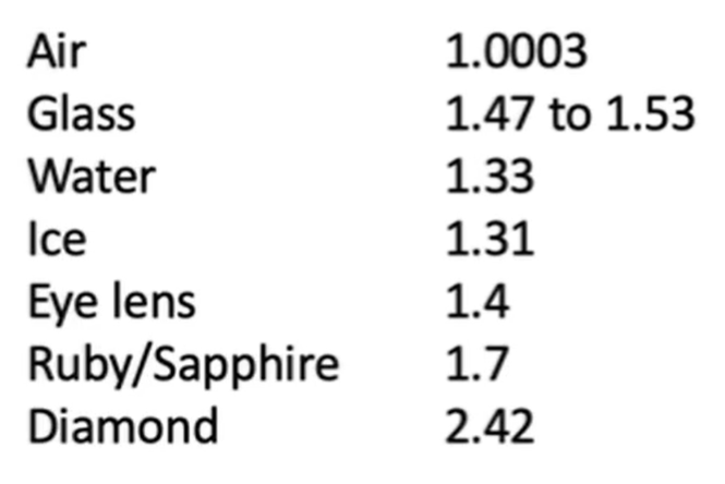 This change in speed causes the change in direction, as per Christian Huygen’s theory. The behaviour of light as it goes from one medium to another is known as Snell’s law, shown in the equation. The angle is measured relative to the normal of the surface, regardless of the direction in which the light goes. The ray ‘bends’ towards the normal in the medium with a higher index of refraction.