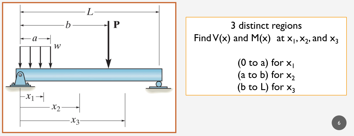 To do this, method of sections must be used to determine load variation by solving for and to plot on Shear and Bending moment diagrams respectively. These equations must be derived for each section of a beam that has a different loading, since they’re discontinuous at points where distributed load changes or where concentrated forces or couple moments are applied.